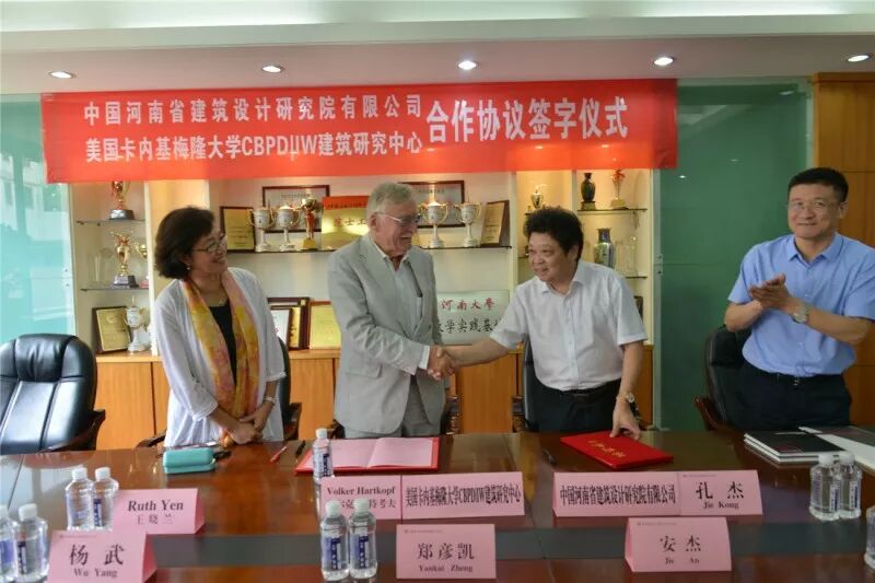 交流會結(jié)束后,Volker Hartkopf主任、Ruth Yen顧問一行來到公司二樓會議室,參加中國河南省建筑設(shè)計研究院有限公司與美國卡內(nèi)基梅隆大學(xué)CBPD|IW建筑研究中心合作協(xié)議簽字儀式。公司董事長、總經(jīng)理孔杰,黨委書記、常務(wù)副總經(jīng)理安杰等相關(guān)領(lǐng)導(dǎo)出席簽字儀式。